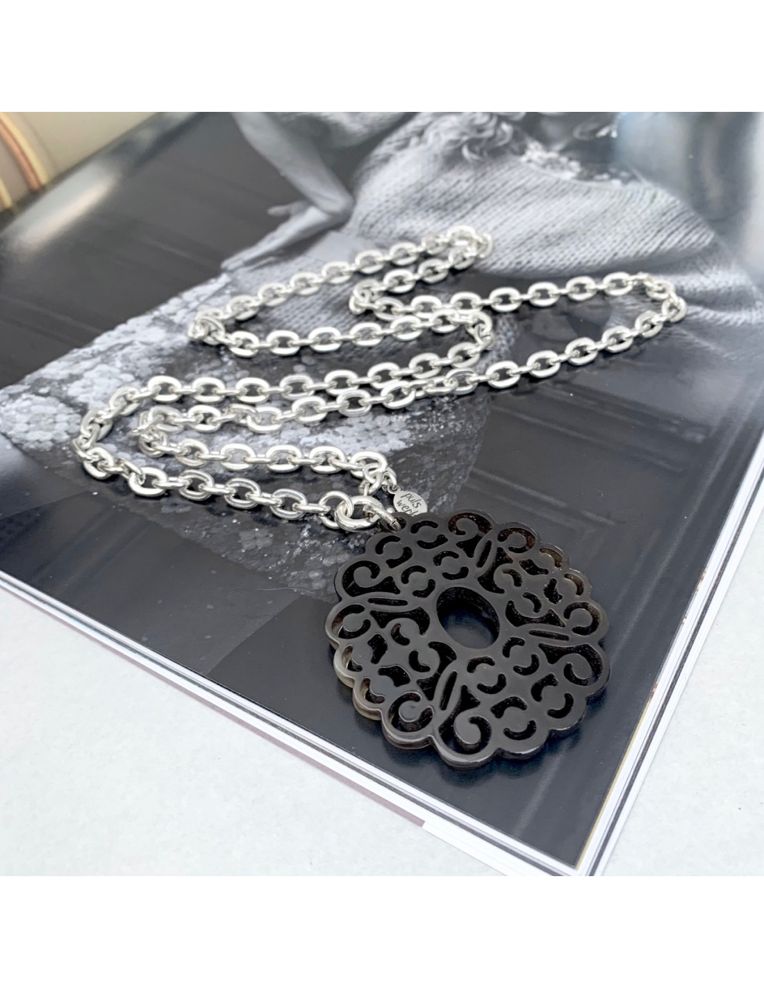 Ein stylisches Schmuckstück ist diese tolle Ankerkette aus massivem Silber, das verschnörkelte Medaillon aus Horn am runden Verschluss, wir tragen die Halskette mit Anhänger oder ohne, ganz nach Lust und Laune, aus 925 Sterling Silber ...weitere Details in der folgenden Beschreibung...