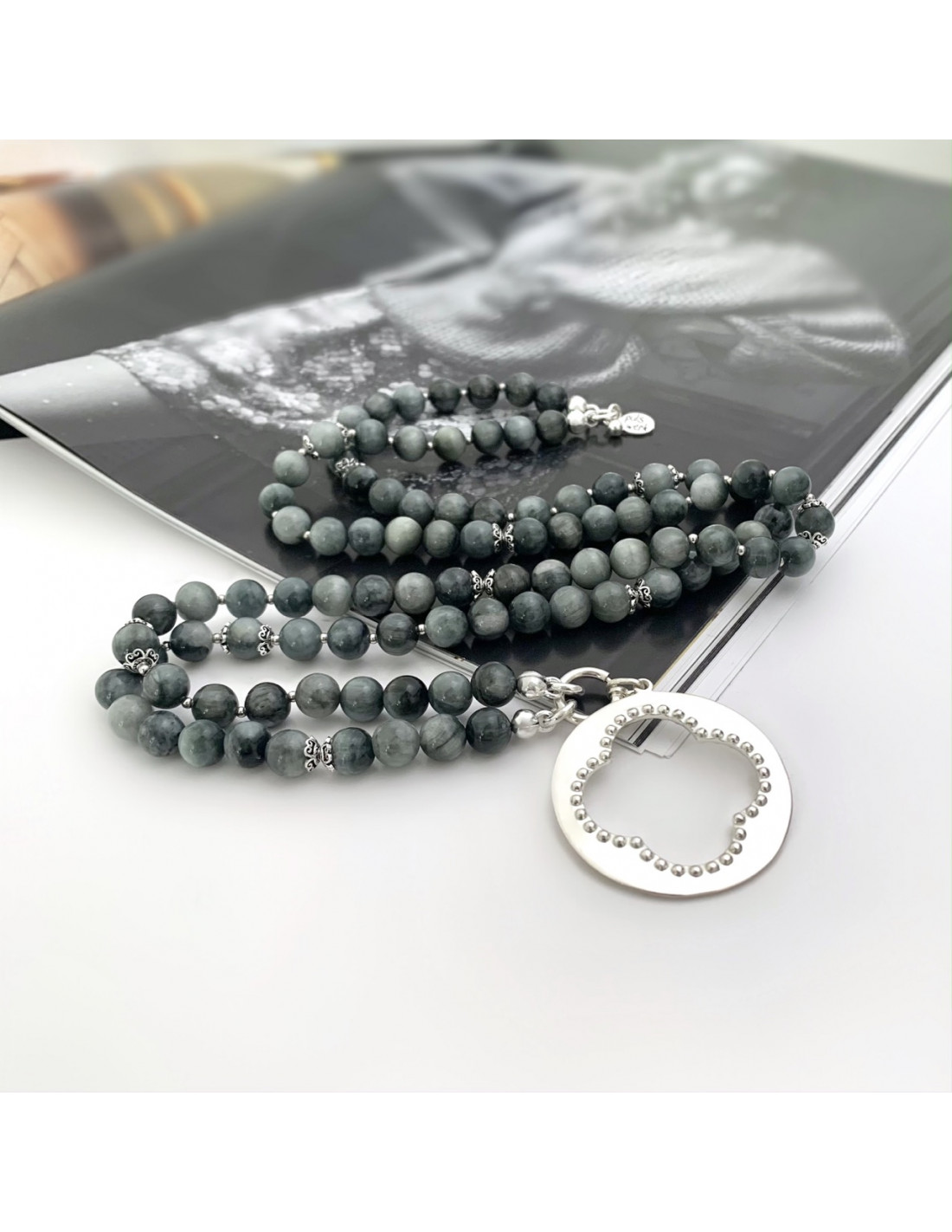 Ein sehr schöner edler Stein ist dieser Adlerauge aus verschiedenen grauen Farbnuancen, von hellem Grau bis zu Anthrazit und je nach Lichteinfall anders leuchtend, wir haben diese stylische Halskette mit verschiedenen Silberelemenenten und Silberkügelchen kreiert, das besondere Blumen-Amulett am runden Verschluss, aus 925 Sterling Silber ...weitere Details in der folgenden Beschreibung...
