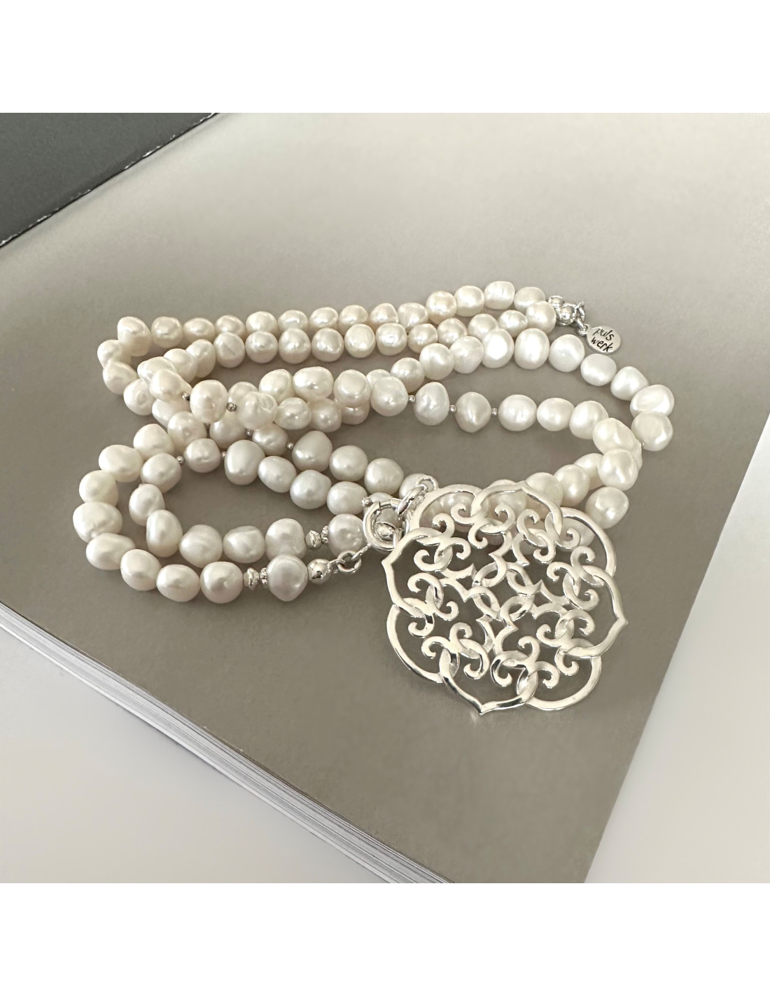 Edel, elegant und immer ein Hingucker, die écrufarbigen auserlesenen Süsswasserperlen haben wir mit Silberelementen zu einer stylischen Halskette kreiert, das Silbermedaillon am runden Verschluss, aus 925 Sterling Silber ...weitere Details in der folgenden Beschreibung...