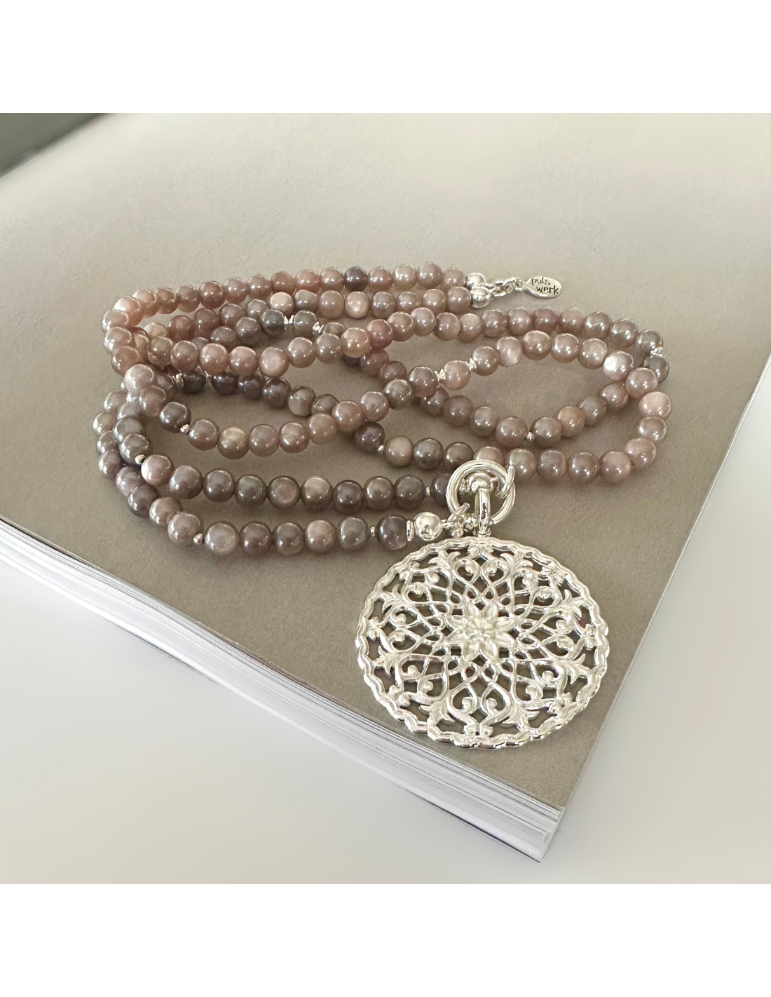 Für diese Halskette verwenden wir einen widerstandsfähigen Faden, farblich passend zum Stein, dabei ist der 4fach-Abschluss doppelt gesichert. Die Kette fällt mit dieser Verarbeitung sehr schön und wird Ihnen lange viel Freude bereiten. Für die kleinsten Silberkügelchen verwenden wir rhodiniertes Sterling Silber. Die Länge ist ohne das Medaillon gerechnet. Wir tragen die Halskette mit oder ohne Anhänger, ganz nach Lust und Laune. Dieser Mondstein wurde speziell behandelt, damit er besonders leuchtet und wirkt so sehr edel.