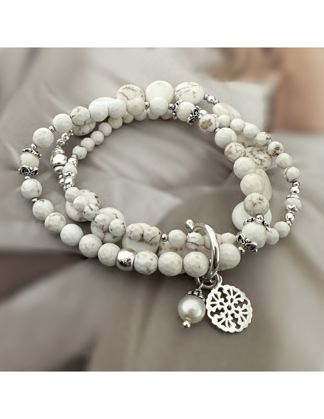 Schlicht in der Farbe und so bestimmt immer passend ist dieser Armschmuck aus Dendritenjaspis in écru und fein beige melierten Farbnuancen, besonders gefällt uns hier die Kombination aus polierten Linsen und matten kleinen Steinen, und Silberelementen und Silberkügelchen, das filigrane Medaillon und die Süsswasserperle am runden Verschluss ...aus 925 Sterling Silber