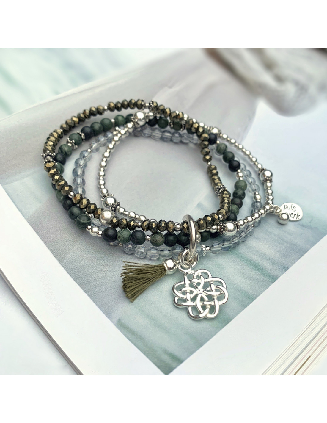 Es sind die kleinen Details, die wir lieben, grün melierten Regenbogenjaspis, facettierter Pyrit, gräulich leuchtender Bergkristall, vielen Silberelementen und Silberkügelchen, das Medaillon aus massivem Silber und die farblich passende olivegrüne Quaste am runden Karabiner, ein Schmuckstück, das man einfach lieben muss, aus 925 Sterling Silber ...weitere Infos in der folgenden Beschreibung...