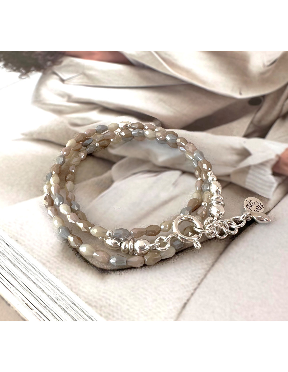 Ein Armband zum Umwickeln aus fein facettiertem Zirkonia in taupe, beige und hellgrau, Silberkügelchen und einer zusätzlichen Silberkette als Verlängerung oder zur Zierde am runden Verschluss, aus 925 Sterling Silber ...weitere Details in der folgenden Beschreibung...